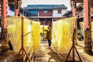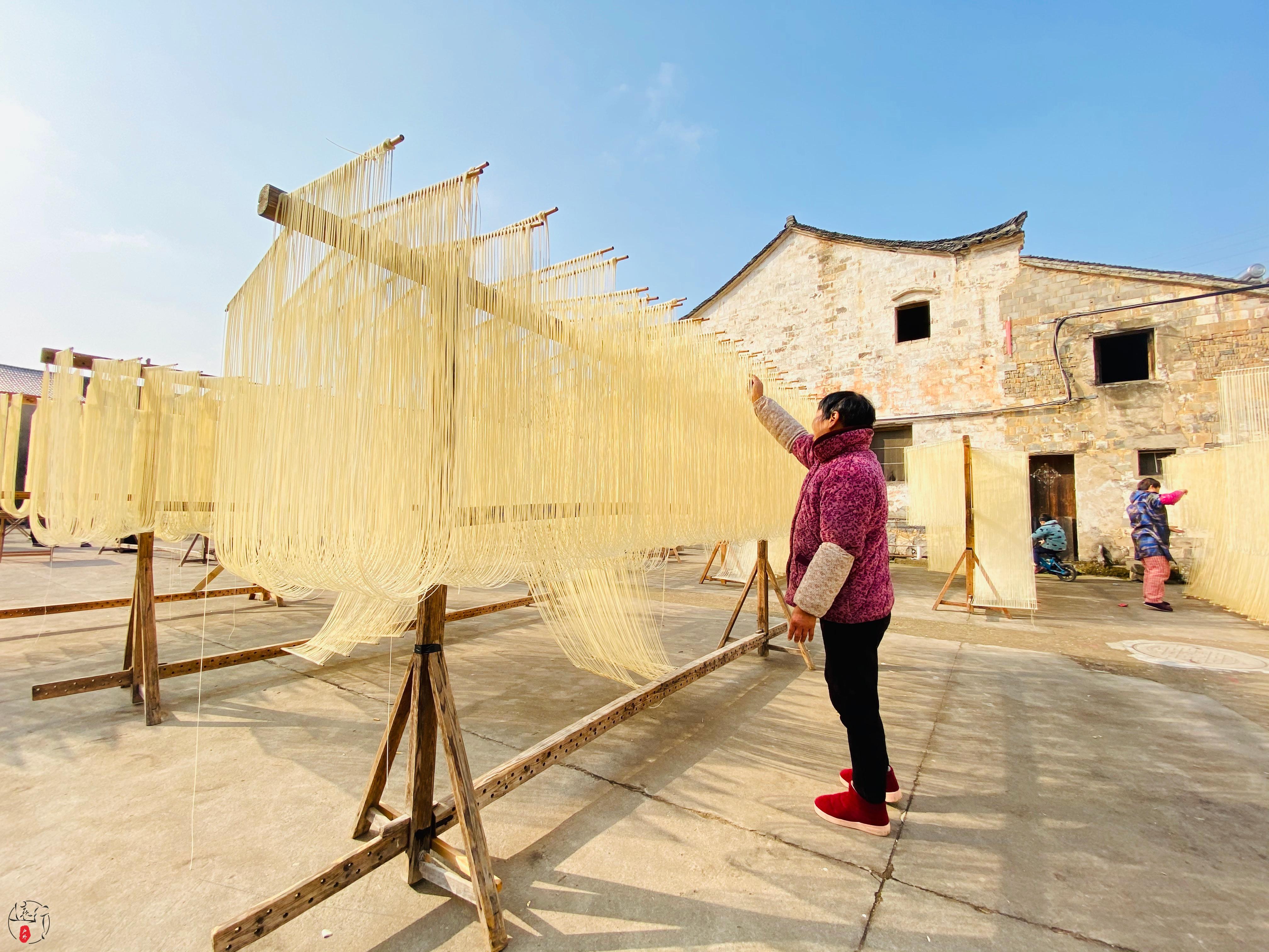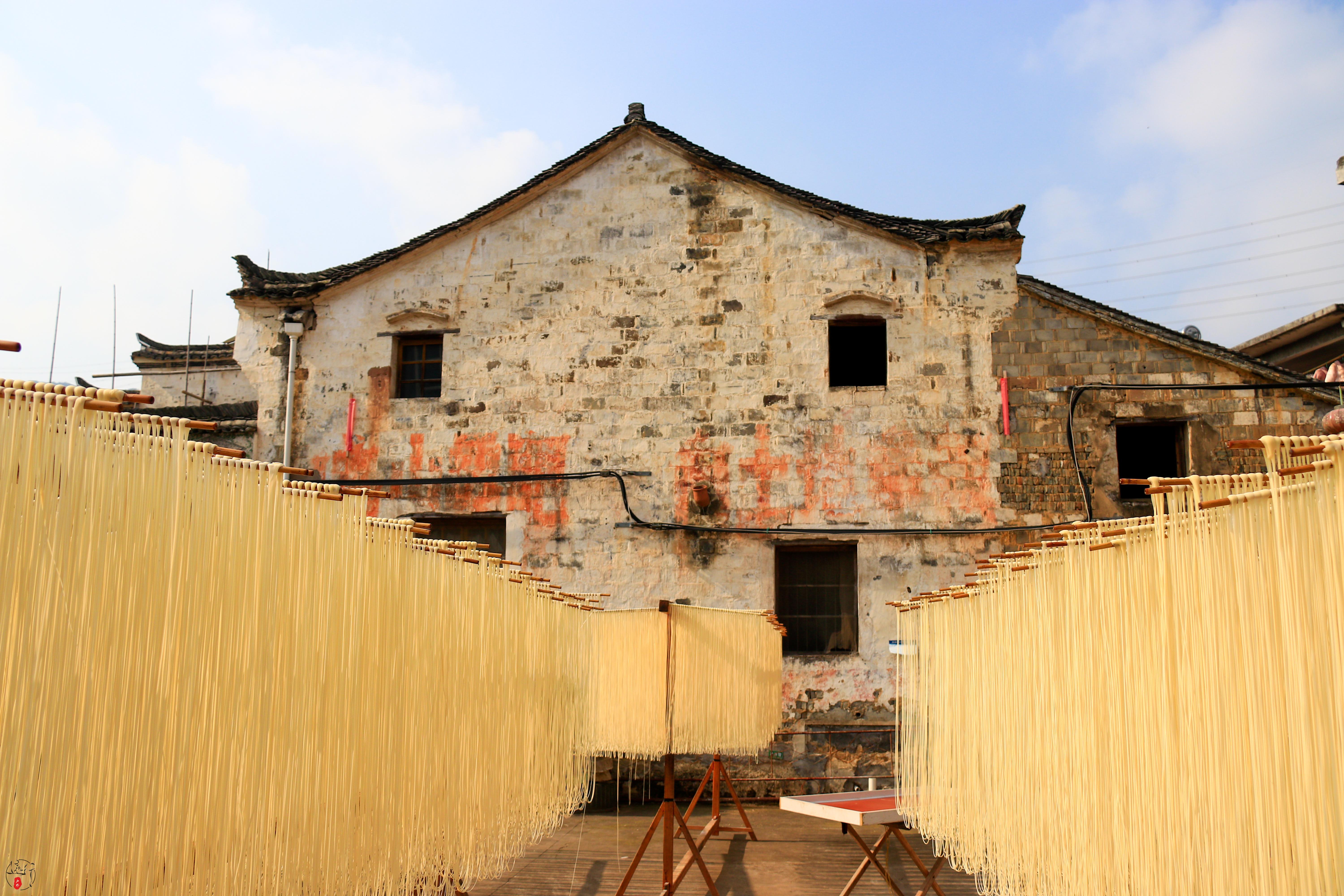 2.5小时后 我们来到浙中的一个小山村——“挂面村”!我们可以在挂面村里逛逛拍拍。据老村长讲,秋冬时节,天气晴朗之日,就可以看到壮观的【面条瀑布】,这里每家每户都在做面,随处可见瀑布般的晒面架,喜欢摄影的驴友,大可尽兴创作,丝丝缕缕的几何线条,搭配古朴素雅的迷人古村,解放你的相机快门吧!