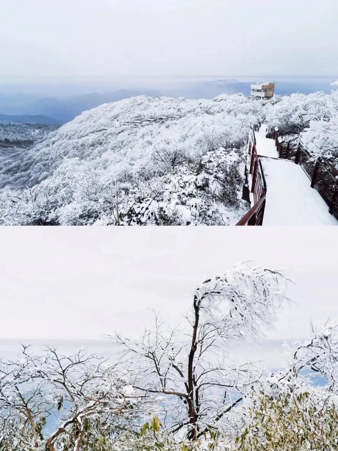 大约1.5小时 到达目的地后,下车整队出发。沿途植被根据海拔的提升,依次为竹林、杉木混合林、矮灌木丛、高山草甸,充满了自然和野趣。12:30左右,我们登上山顶巨岩,视野广阔,等于巨大的天然观景台。在上面眺望远方,只见千里冰封,万里雪飘,南国雪色美不胜收。