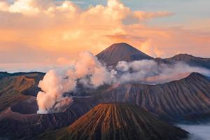日出即将升起,云雾开始弥漫,火山喷着烟雾
