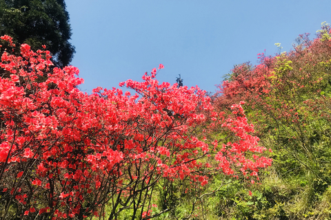10:00 抵达徒步点,下车整顿出发,穿过村子,我们踏上乡间小道,一路春意盎然。大约40分钟,到达轿子岩,百亩杜鹃林突然出现在我们面前,漫山遍野的杜鹃花“明火执仗”地盛开着,令人眼花绕乱,目眩神迷。尽情欣赏,摄影。(小编提醒:爱护野生杜鹃,折花者可能会受到当地护花者谴责)满山鲜艳的映山红,连绵不绝,染红了整个山坡,来张酷炫的大合影,休整后下到环线下山走到村口上车,返回杭州!