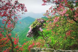2.云台山也随野杜鹃走出“深闺”而一举成名。因为常年封山育林,云台山的映山红一度被隐藏在深山中,直到最近,当地人小面积清理杂草杂柴后方才大规模显现。从山下的古村沿着登山小道,顺溪流而上,春风佛面,泉声潺潺,绿树青山中片片火红灿若红霞,正如宋时杨万里的诗句“一路山花不负侬”。